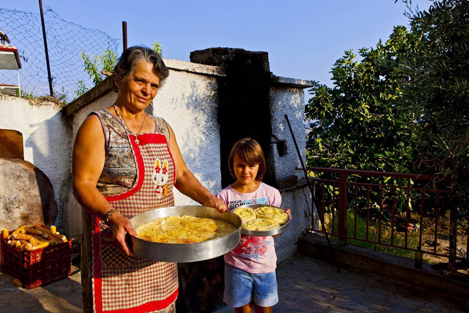 Wild herbs growing in the region are used as fillings for a variety of delicious pies. Their combination with local feta cheese and trahana (a wheat-based porridge-type dish) enhances the overall pie-experience. Herbs cannot be added raw, they have to be braised first. When making the pastry “phyllo” (the paper-thin top layer of pies), adding local dairy products, like yogurt and milk, a dab of corn oil and a pinch of soda in the flour makes all the difference.